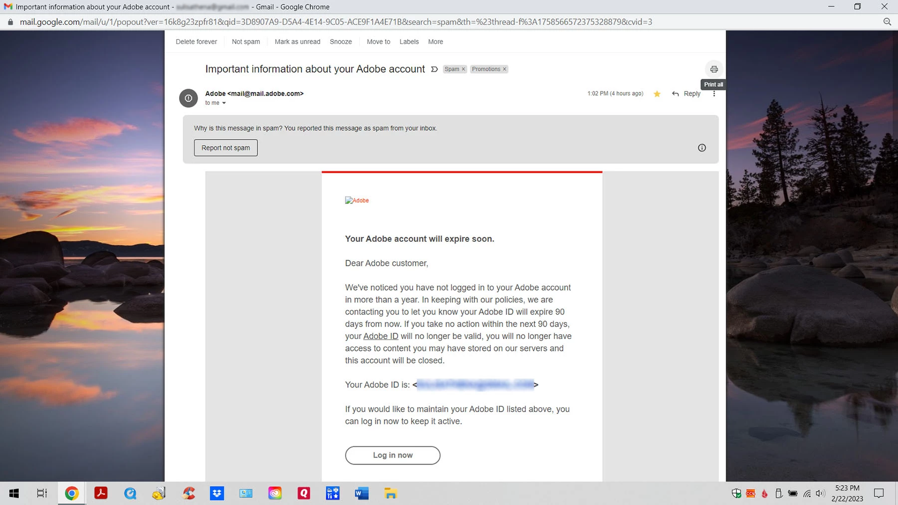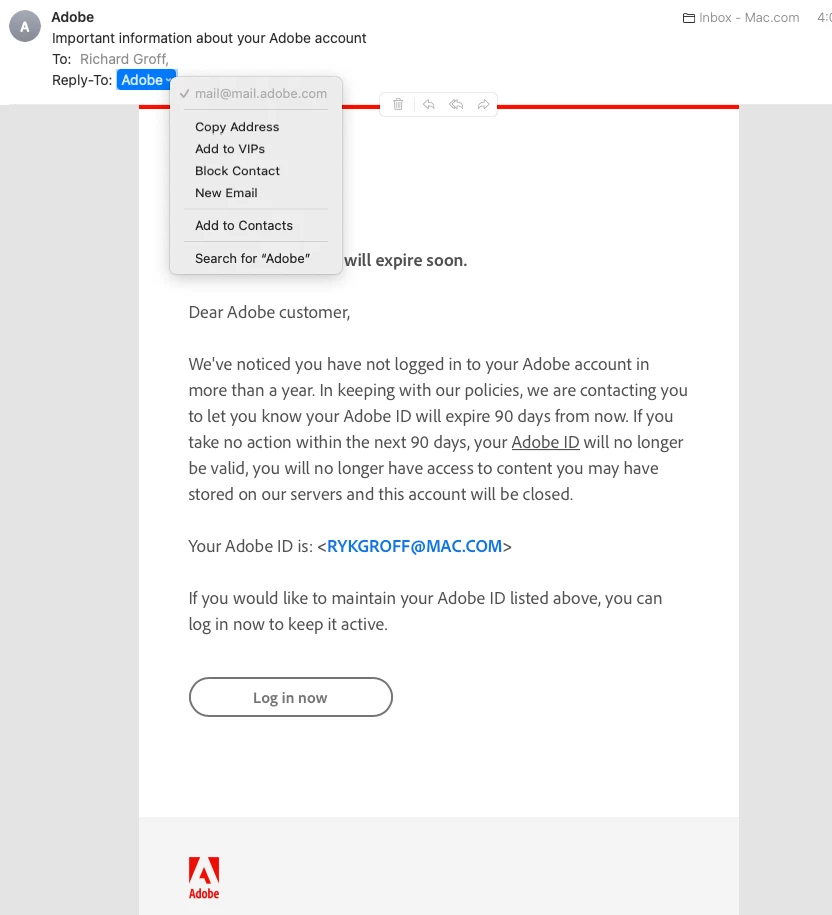 We've noticed you have not logged in to your Adobe account in more than a year. In keeping with our policies, we are contacting you to let you know your Adobe ID will expire 90 days from now. If you take no action within the next 90 days, your Adobe ID will no longer be valid, you will no longer have access to content you may have stored on our servers and this account will be closed.