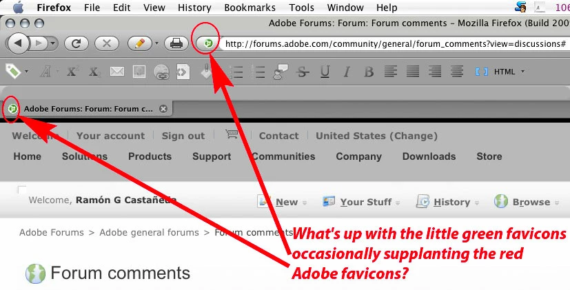 This happens at random, many times per day. The red Adobe favicons fail to appear while waiting for data from adobe.com, and then these little green favicons end up showing up instead in the address bar, the tab name and even in the bookmark menus.