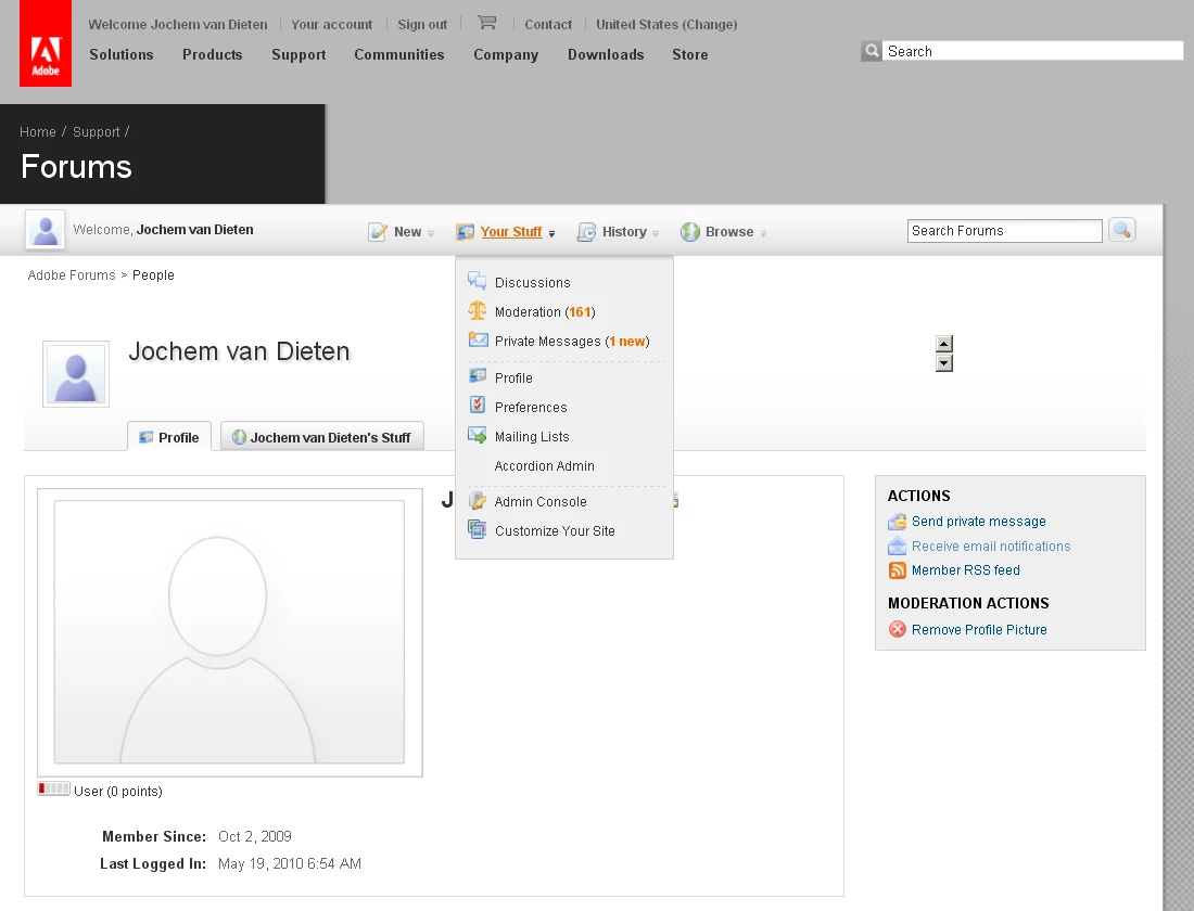 This morning I noticed an interesting new variation on the split account problem. As you can see from the screenshot the registration date of the profile is late 2009. That is becuase it is from the account http://forums.adobe.com/people/Jochem%20van%20Dieten-QHlmGd Yet the moderation and private messages counts you see are from the account http://forums.adobe.com/people/Jochem%20van%20Dieten and clicking on the moderation queue link brought me back to the same page. So it looks like I am logged in as 2 accounts simultaneously.