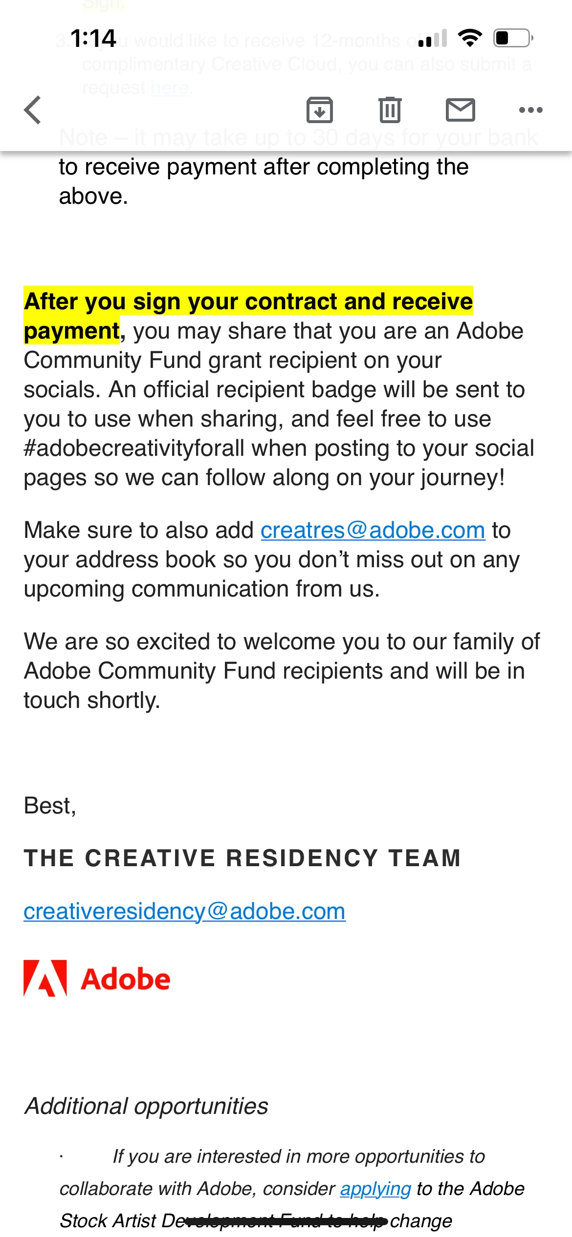 Congratulations! Creative Residency Fund is a legitimate Adobe Program.