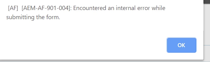 HTTP/1.1] libs.fd.afaddon.components.actions.fdm.post$POST$jsp There was an issue in submitting the form using Form data model submit service 24.09.2019 10:59:12.792 *ERROR* [103.76.232.57 [1569322752776] POST /content/forms/af/pennsylvania/return-to-work-form-swagger/jcr:content/guideContainer.af.submit.jsp HTTP/1.1] com.adobe.aemds.guide.servlet.GuideSubmitServlet Error during submission org.apache.sling.api.scripting.ScriptEvaluationException: at org.apache.sling.scripting.core.impl.DefaultSlingScript.call(DefaultSlingScript.java:416) [org.apache.sling.scripting.core:2.0.54] at org.apache.sling.scripting.core.impl.DefaultSlingScript.eval(DefaultSlingScript.java:184) [org.apache.sling.scripting.core:2.0.54] at org.apache.sling.scripting.core.impl.DefaultSlingScript.service(DefaultSlingScript.java:491) [org.apache.sling.scripting.core:2.0.54] at org.apache.sling.engine.impl.request.RequestData.service(RequestData.java:552) [org.apache.sling.engine:2.6.12] at org.apache.sling.engine.impl.filter.SlingComponentFilterChain.render(SlingComponentFilterChain.java:44) [org.apache.sling.engine:2.6.12] at org.apache.sling.engine.impl.filter.AbstractSlingFilterChain.doFilter(AbstractSlingFilterChain.java:77) [org.apache.sling.engine:2.6.12] at com.day.cq.wcm.core.impl.WCMDeveloperModeFilter.doFilter(WCMDeveloperModeFilter.java:119) [com.day.cq.wcm.cq-wcm-core:5.11.218] at org.apache.sling.engine.impl.filter.AbstractSlingFilterChain.doFilter(AbstractSlingFilterChain.java:68) [org.apache.sling.engine:2.6.12] at com.day.cq.wcm.core.impl.WCMDebugFilter.doFilterWithErrorHandling(WCMDebugFilter.java:192) [com.day.cq.wcm.cq-wcm-core:5.11.218] at com.day.cq.wcm.core.impl.WCMDebugFilter.doFilter(WCMDebugFilter.java:159) [com.day.cq.wcm.cq-wcm-core:5.11.218] at org.apache.sling.engine.impl.filter.AbstractSlingFilterChain.doFilter(AbstractSlingFilterChain.java:68) [org.apache.sling.engine:2.6.12] at com.day.cq.wcm.core.impl.WCMComponentFilter.doFilter(WCMComponentFilter.java:165) [com.day.cq.wcm.cq-wcm-core:5.11.218] at org.apache.sling.engine.impl.filter.AbstractSlingFilterChain.doFilter(AbstractSlingFilterChain.java:68) [org.apache.sling.engine:2.6.12] at com.day.cq.wcm.core.impl.PageLockFilter.doFilter(PageLockFilter.java:91) [com.day.cq.wcm.cq-wcm-core:5.11.218] at org.apache.sling.engine.impl.filter.AbstractSlingFilterChain.doFilter(AbstractSlingFilterChain.java:68) [org.apache.sling.engine:2.6.12] at com.day.cq.personalization.impl.TargetComponentFilter.doFilter(TargetComponentFilter.java:96) [com.day.cq.cq-personalization:5.11.58] at org.apache.sling.engine.impl.filter.AbstractSlingFilterChain.doFilter(AbstractSlingFilterChain.java:68) [org.apache.sling.engine:2.6.12] at org.apache.sling.engine.impl.SlingRequestProcessorImpl.processComponent(SlingRequestProcessorImpl.java:282) [org.apache.sling.engine:2.6.12] at org.apache.sling.engine.impl.SlingRequestProcessorImpl.dispatchRequest(SlingRequestProcessorImpl.java:322) [org.apache.sling.engine:2.6.12] at org.apache.sling.engine.impl.request.SlingRequestDispatcher.dispatch(SlingRequestDispatcher.java:211) [org.apache.sling.engine:2.6.12] at org.apache.sling.engine.impl.request.SlingRequestDispatcher.include(SlingRequestDispatcher.java:104) [org.apache.sling.engine:2.6.12] at com.day.cq.wcm.core.impl.WCMComponentFilter$ForwardRequestDispatcher.include(WCMComponentFilter.java:516) [com.day.cq.wcm.cq-wcm-core:5.11.218] at com.day.cq.wcm.foundation.forms.FormsHelper.includeResource(FormsHelper.java:616) [com.day.cq.wcm.cq-wcm-foundation:5.11.46] at com.day.cq.wcm.foundation.forms.FormsHelper.runAction(FormsHelper.java:285) [com.day.cq.wcm.cq-wcm-foundation:5.11.46] at com.adobe.aemds.guide.servlet.GuideSubmitServlet.doSubmit(GuideSubmitServlet.java:353) [com.adobe.aemds.guide.aemds-guide-core:5.0.124] at com.adobe.aemds.guide.servlet.GuideSubmitServlet.doPost(GuideSubmitServlet.java:562) [com.adobe.aemds.guide.aemds-guide-core:5.0.124] at org.apache.sling.api.servlets.SlingAllMethodsServlet.mayService(SlingAllMethodsServlet.java:146) [org.apache.sling.api:2.16.4] at org.apache.sling.api.servlets.SlingSafeMethodsServlet.service(SlingSafeMethodsServlet.java:342) [org.apache.sling.api:2.16.4] at org.apache.sling.api.servlets.SlingSafeMethodsServlet.service(SlingSafeMethodsServlet.java:374) [org.apache.sling.api:2.16.4] at org.apache.sling.engine.impl.request.RequestData.service(RequestData.java:552) [org.apache.sling.engine:2.6.12] at org.apache.sling.engine.impl.filter.SlingComponentFilterChain.render(SlingComponentFilterChain.java:44) [org.apache.sling.engine:2.6.12] at org.apache.sling.engine.impl.filter.AbstractSlingFilterChain.doFilter(AbstractSlingFilterChain.java:77) [org.apache.sling.engine:2.6.12] at com.day.cq.wcm.core.impl.WCMDebugFilter.doFilterWithErrorHandling(WCMDebugFilter.java:192) [com.day.cq.wcm.cq-wcm-core:5.11.218] at com.day.cq.wcm.core.impl.WCMDebugFilter.doFilter(WCMDebugFilter.java:159) [com.day.cq.wcm.cq-wcm-core:5.11.218] at org.apache.sling.engine.impl.filter.AbstractSlingFilterChain.doFilter(AbstractSlingFilterChain.java:68) [org.apache.sling.engine:2.6.12] at com.day.cq.wcm.core.impl.WCMComponentFilter.filterRootInclude(WCMComponentFilter.java:375) [com.day.cq.wcm.cq-wcm-core:5.11.218] at com.day.cq.wcm.core.impl.WCMComponentFilter.doFilter(WCMComponentFilter.java:190) [com.day.cq.wcm.cq-wcm-core:5.11.218] at org.apache.sling.engine.impl.filter.AbstractSlingFilterChain.doFilter(AbstractSlingFilterChain.java:68) [org.apache.sling.engine:2.6.12] at com.day.cq.wcm.core.impl.PageLockFilter.doFilter(PageLockFilter.java:91) [com.day.cq.wcm.cq-wcm-core:5.11.218] at org.apache.sling.engine.impl.filter.AbstractSlingFilterChain.doFilter(AbstractSlingFilterChain.java:68) [org.apache.sling.engine:2.6.12] at com.day.cq.personalization.impl.TargetComponentFilter.doFilter(TargetComponentFilter.java:96) [com.day.cq.cq-personalization:5.11.58] at org.apache.sling.engine.impl.filter.AbstractSlingFilterChain.doFilter(AbstractSlingFilterChain.java:68)