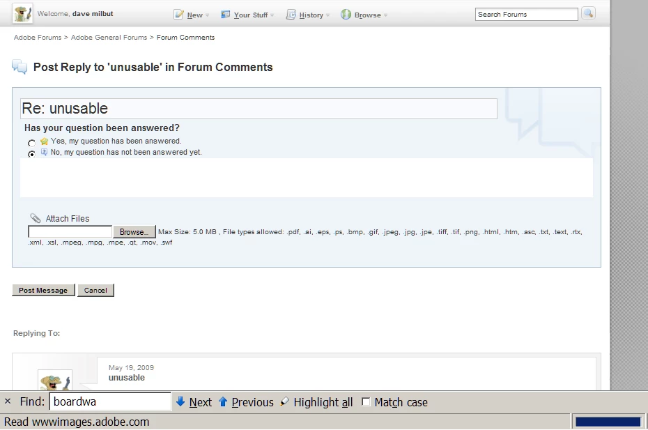 unusable for me today. between 404 errors and waiting for stats.adobe.com and wwwimages.adobe.com and the posting box never appearing when i go to place a response to something. i think i've made like 2 posts today. i'm not willing to wait 2-5 MINUTES for things to finish downloading or to hit reload then reload again (at 30 secs a pop) to clear out 404 errors.