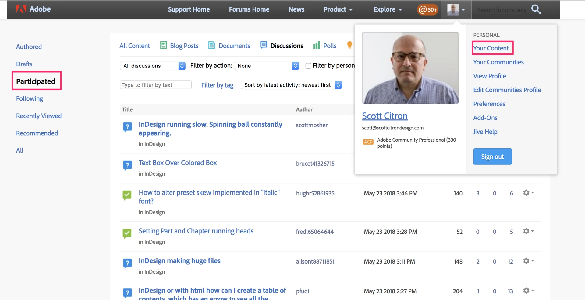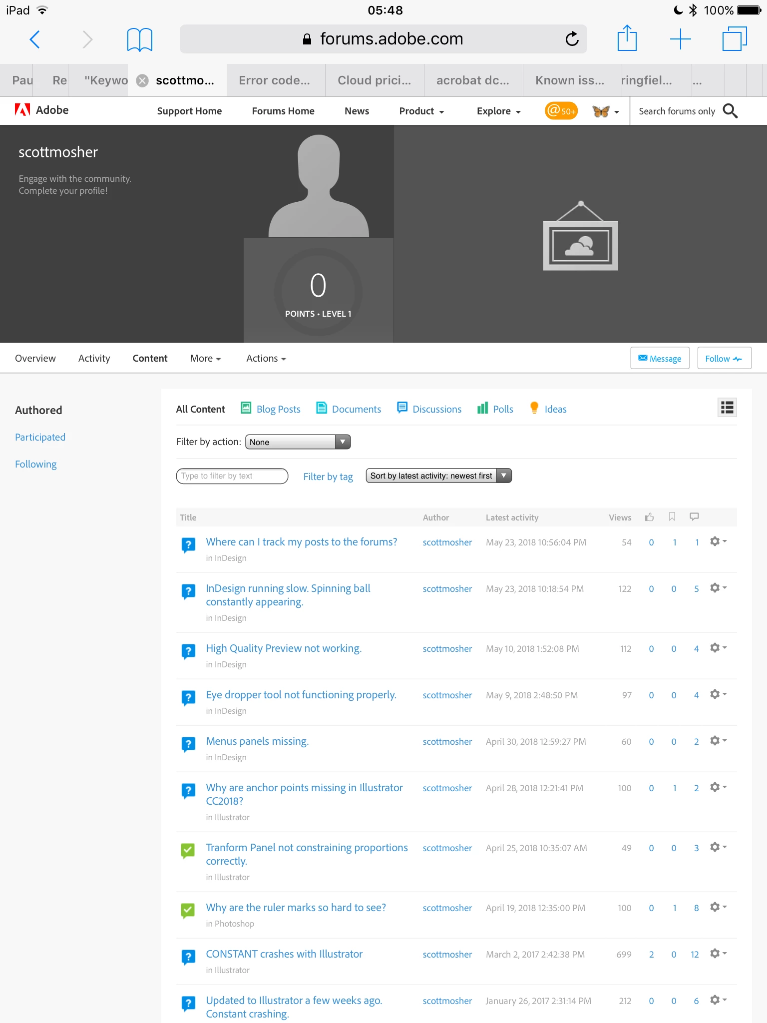 Is there somewhere in my PROFILE or ACCOUNT where I can track all my posts to the forums for easy access? I have been on chat with Adobe 'customer service' and have received NO HELP whatsoever. The agent seems totally clueless and in over or out of their depth.