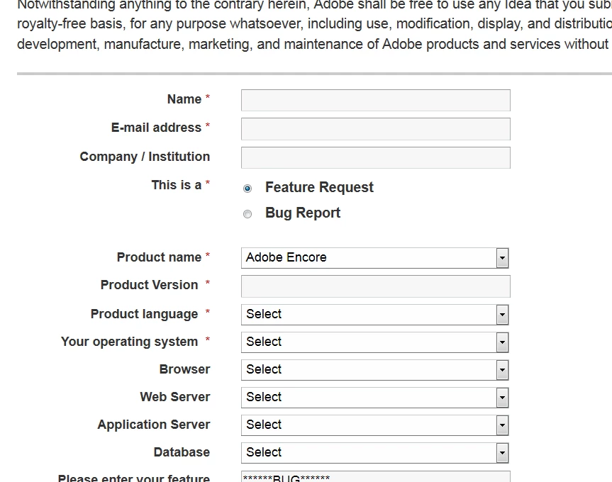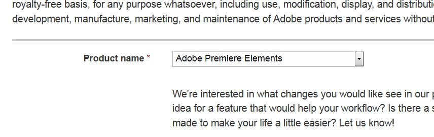 The Feature Request / Bug report form at https://www.adobe.com/cfusion/mmform/index.cfm?name=wishform does not actually provide a form for several of the products (including the two products I use (Premiere & Photoshop Elements).
