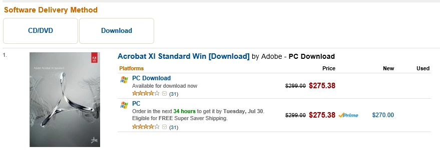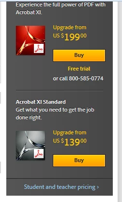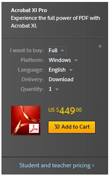 Today I went looking for Acrobat XI Standard (NOT Pro). I still haven't found that. [Correction: I found it while composing this message; see below.] You would think one could find a page to buy something quite easily. Here's my path: Home page->Products (Top Destinations)->Acrobat, then Buying Guide (small print in the middle of the page), then push the Acrobat XI Standard icon, then FAQ(!), then Purchasing Acrobat XI, then How do I buy Acrobat XI. That opens a sub-text in which there is an active llink "Select a store". I push that — and my cart is preloaded with Acrobat XI Pro! No way to buy Standard that I can find!