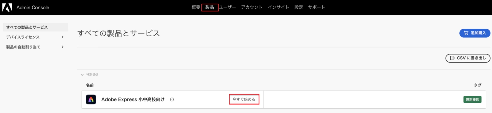 - 取得した特別提供の製品名「Adobe Express 小中高校向け」「高等教育機関向け共有デバイスアクセス」のいずれかをクリック