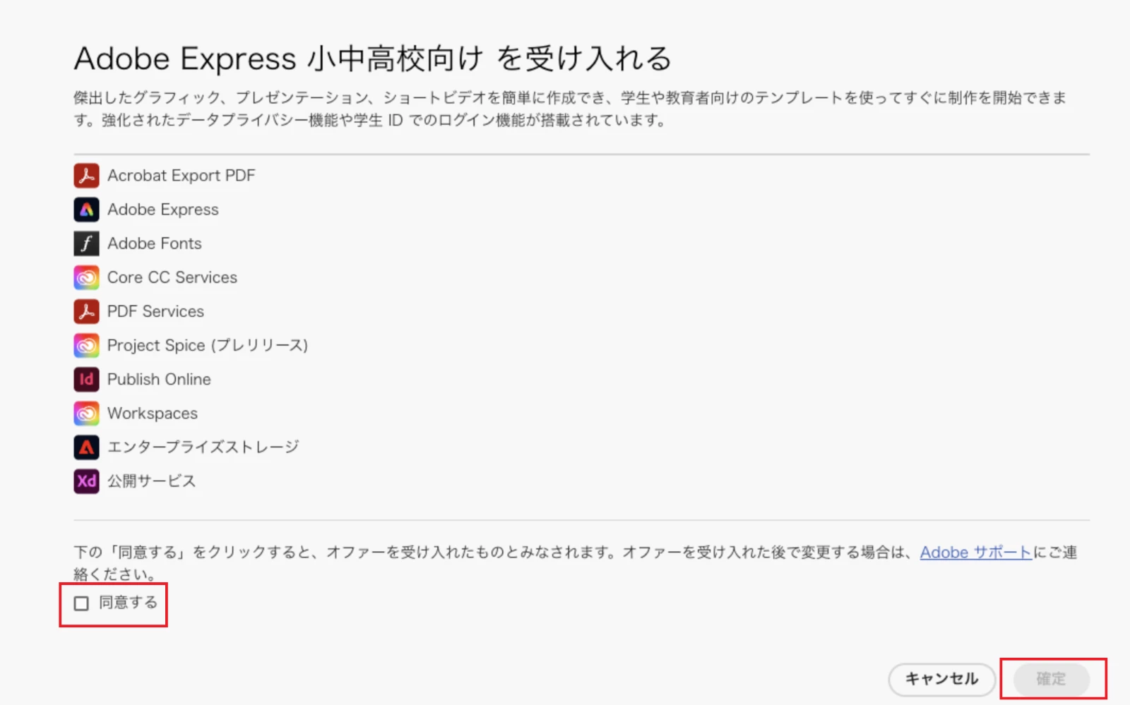 - オファーに同意をいただける場合は、「同意する」 にチェックを入れた上で、「確定」 をクリックします。