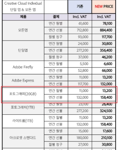 작년 12월 초중반에 일괄적인 포토그래피플랜(20gb)의 월간결제 가격상승(5달러 증가)와