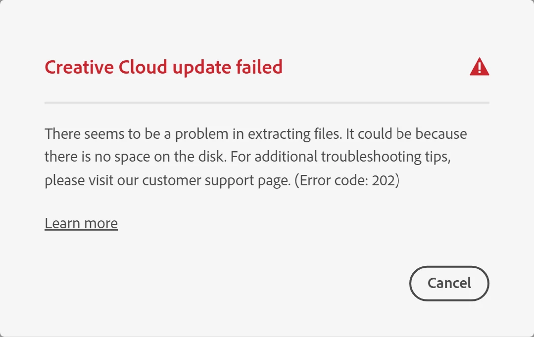 Creative Cloud 데스크탑 앱의 다음 필수 업데이트가 제공될 때 오류 코드 202가 발생할 수 있으므로 해결 방법 3번을 진행하는 경우, 일시적인 해결 방법일 수 있습니다.
