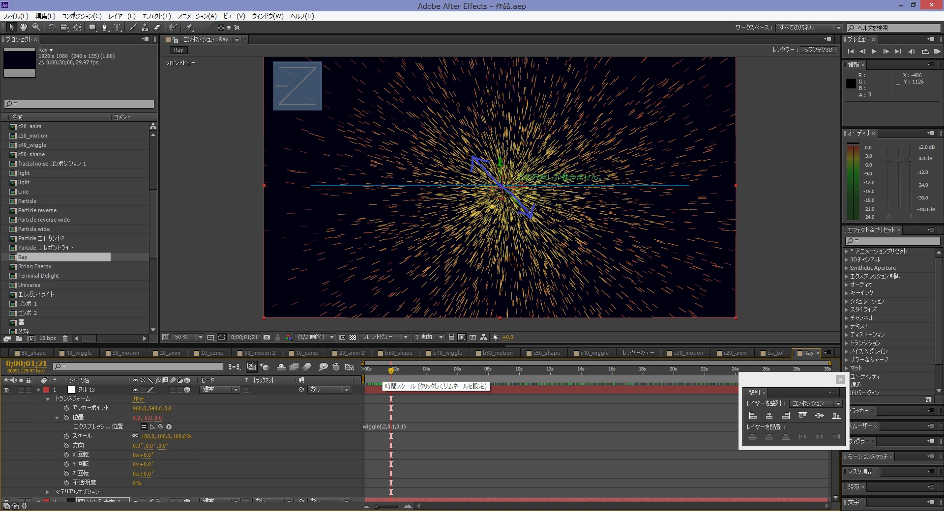 CC particle worldをNULLに紐づけし、そのNULLをウィグルで画面中駆け回ると絵を作りたいのですが