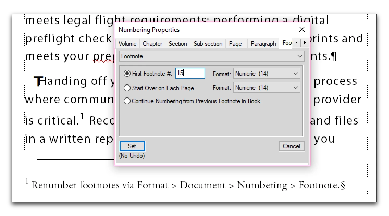 Just as an example, what I need to do with one particular file is have the first footnote be "16" then "17" and all the way up to "20." Then, I want to open the next file and make the first footnote be "21" etc.
