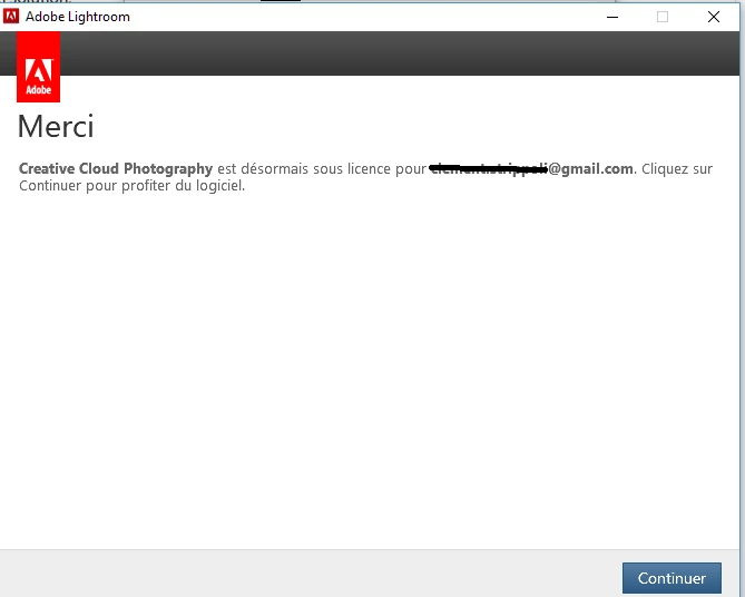 Which basically means "thank you, creative cloud photography is now licensed under 'your email address' click on continue to enjoy the software". When I click on continue the software does not launch, the first message appears again. And this goes on and on and on...