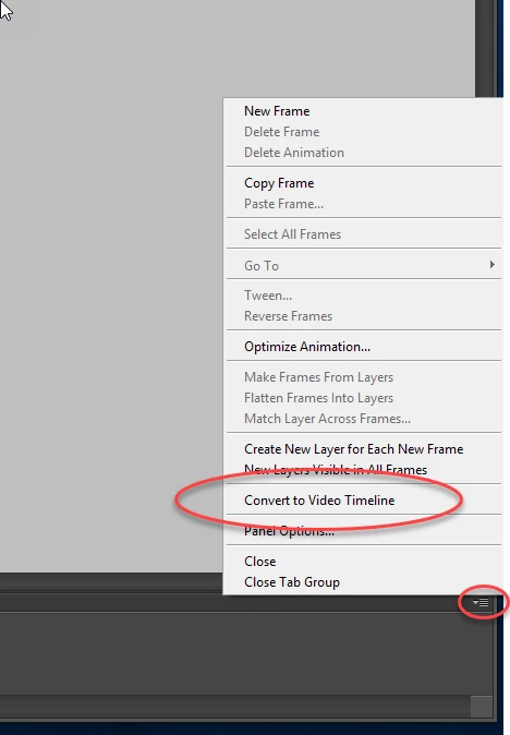 When you first open a timeline there is a drop down to create frame animation or video timeline