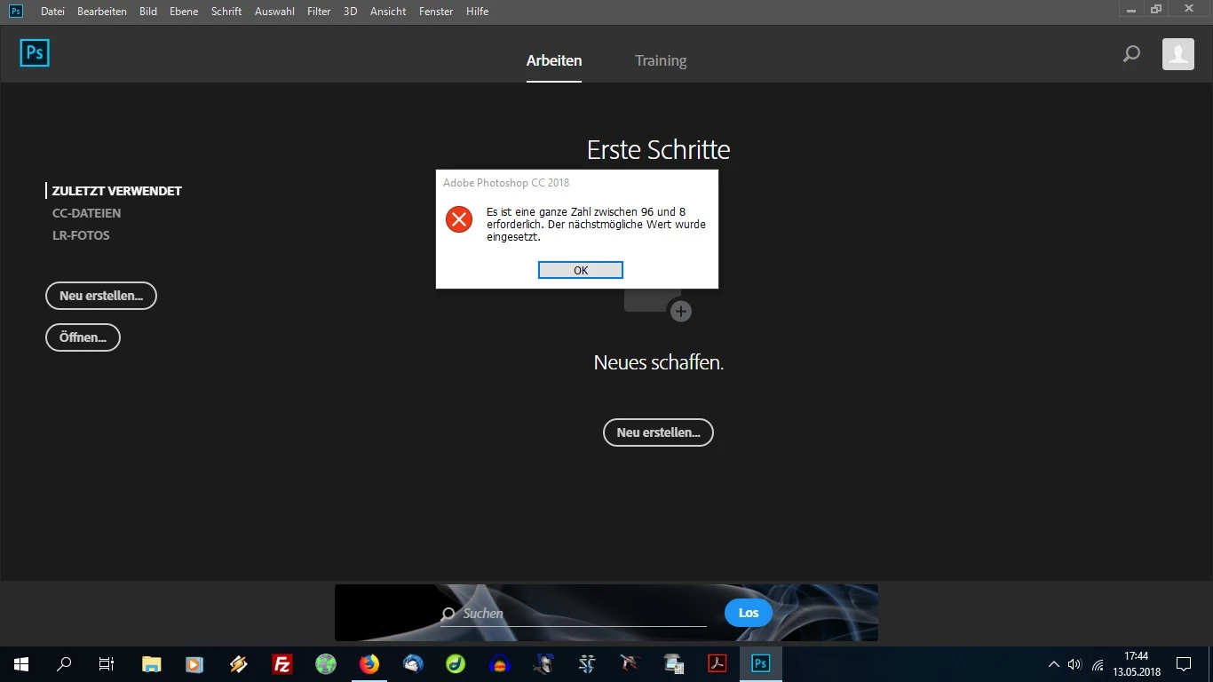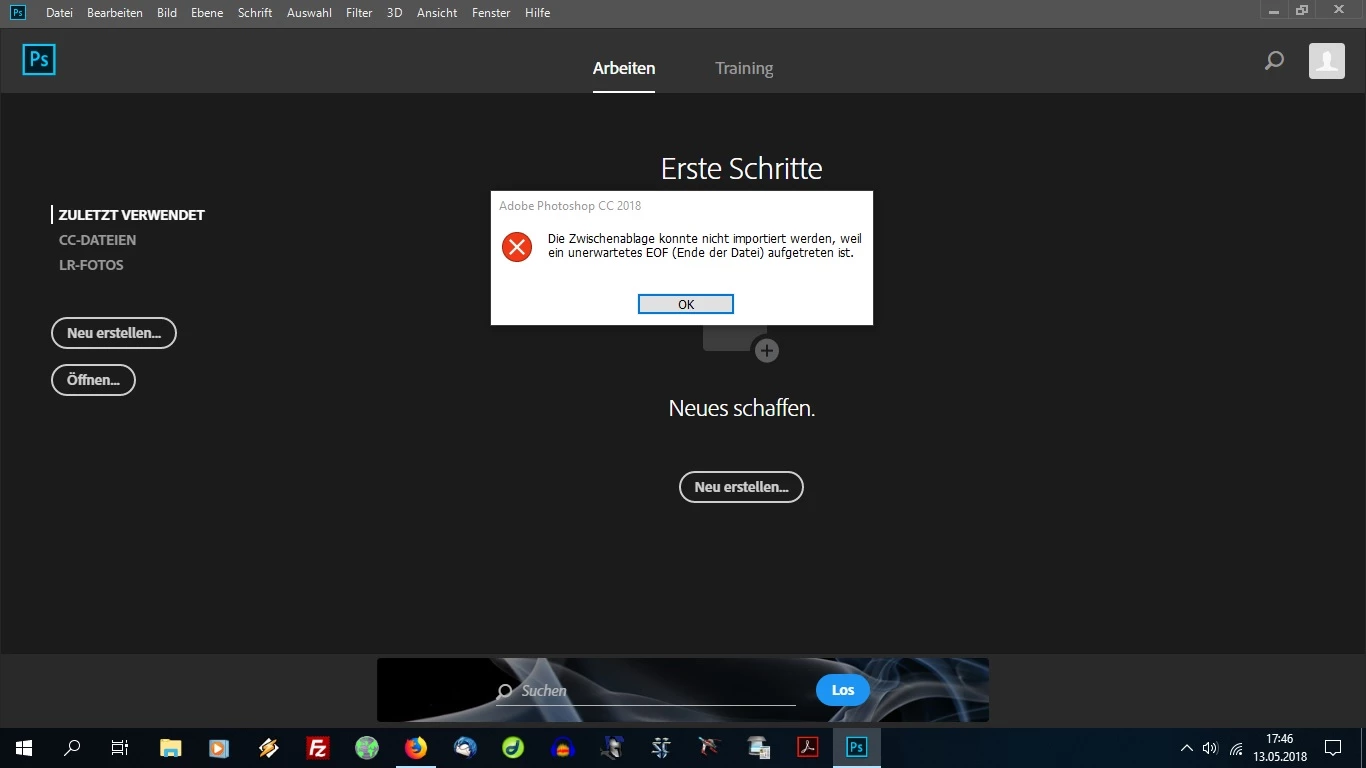 Beim versuch Photoshop zu starten kam die Meldung "Zwischenablage konnte nicht importiert werden wegen unerwartetes EOF"