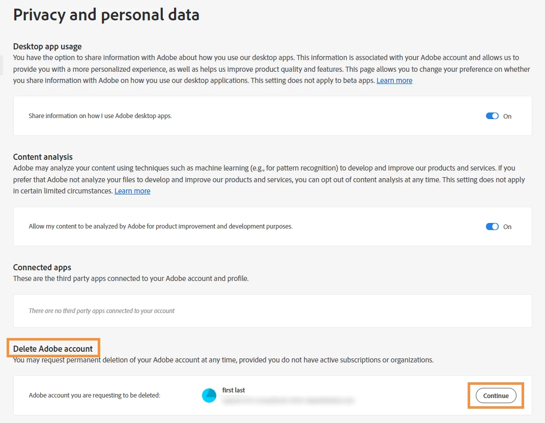 I'm going to delete my adobe account, but i can't do this because the privacy and personal data doesn't have the delete account section.