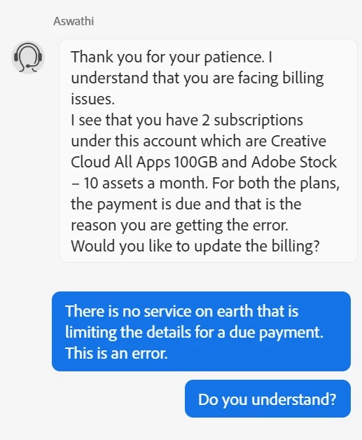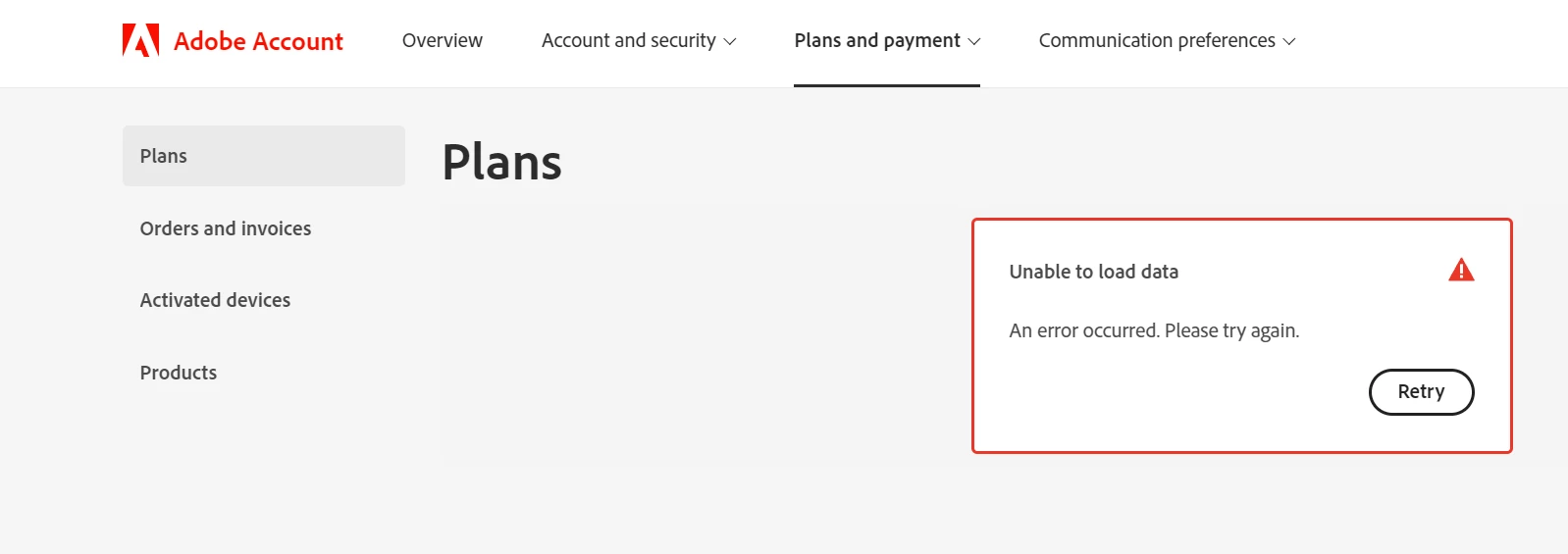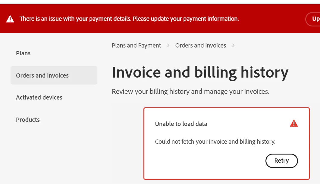 I am trying to cancel my Adobe Subscription since the start of second month of annual plan, and I am unable to do that due months of Adobe Account 'Plans and Payment' section errors which prevents me to do so. I can't even find details. When I escalate the issue to the agents, they simply leave the conversation and telling me that this error is due 'unpaid invoices'. I have no authority nobody to resolve with, this is getting out of hand.