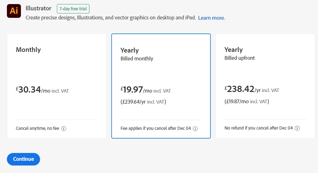 The pricing for Illustrator is the following (quoted below this question). The monthly bill section is confusing me, is it suggesting that it is billed monthly, and at the end of the year it has costed me £239.64? Or is it suggesting me it will cost me £239.64 after my 7 day trial. (It is confusing me because both have written yearly, and there is a third option of £30.34 a month, named as monthly). Which option is the actual monthly one? And if it is the £19.97 one, why does Adobe charge £30.34 under a separate monthly option?