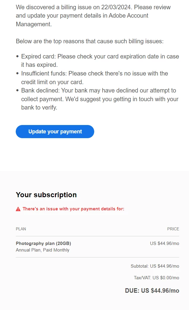 I'm having a problem with cancelling the $9.99 plan. Before, I had cancelled this plan, but then I received an email asking for payment for a package valued at US $44.96/mo. I had not used this plan before. Can anyone help me, please? I sincerely appreciate it!