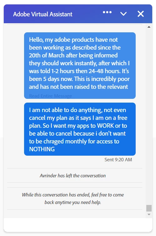 Paying for the full suite of applications, but my account says 'free account' and I cannot access any apps. This has been like this since the 20th March. I've contacted them several times and was just ghosted on my final contact. GG Adobe. Love paying for access to NOTHING.