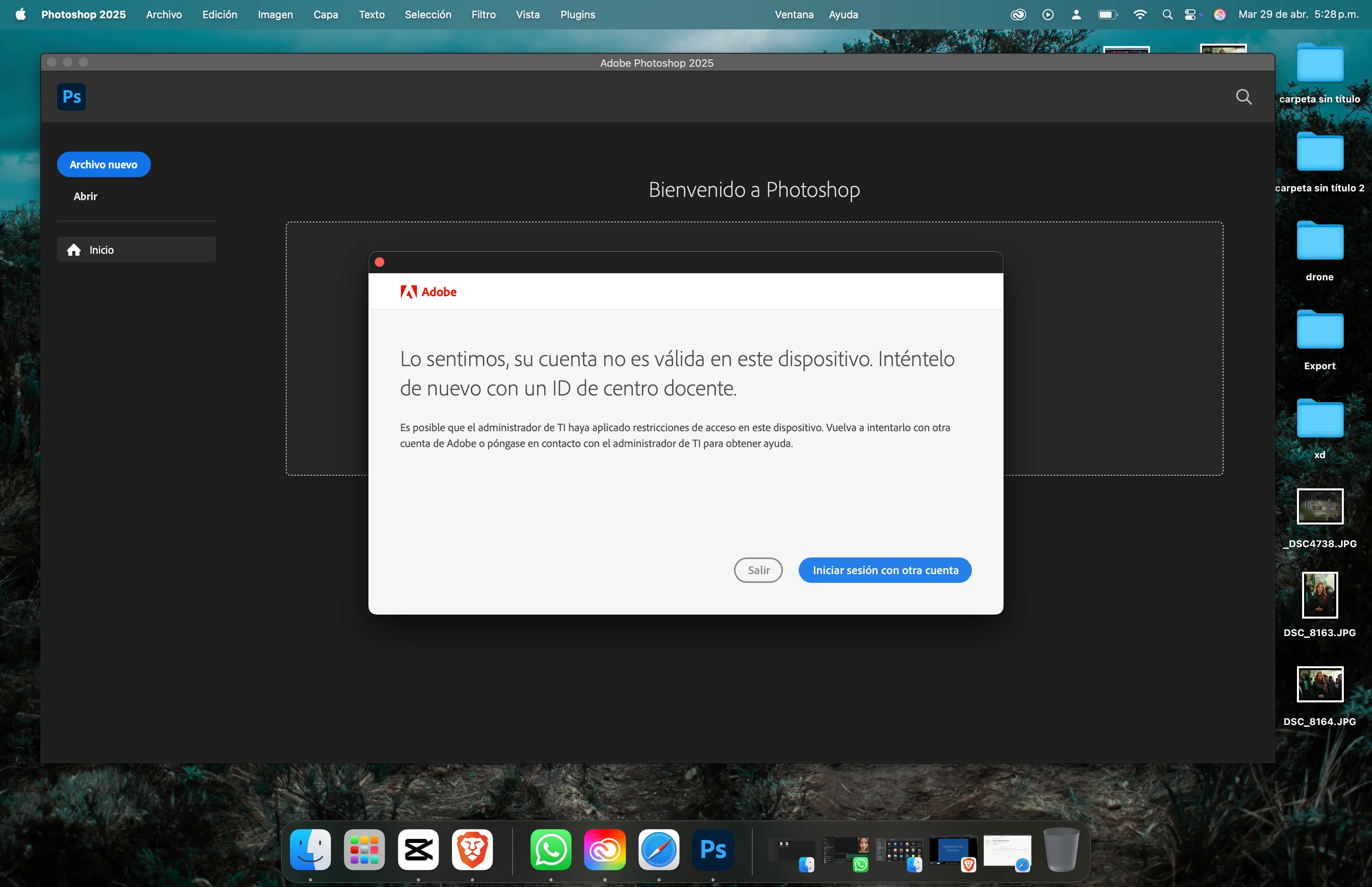 a una cuenta de empresa asociada a esta entidad con un plan empresarial. por razones que no vienen al caso, mi cuenta fue retirada del plan. decidí con esta misma cuenta afiliarme y pagar el plan de estudiantes de adobe, pero al momento de ingresar a cualquiera de las aplicaciones me sale el siguiente mensaje: "Lo sentimos, su cuenta no es valida en este dispositivo. Inténtelo de nuevo con un ID de centro docente". y me solicita salir o iniciar sesion con otra cuenta.