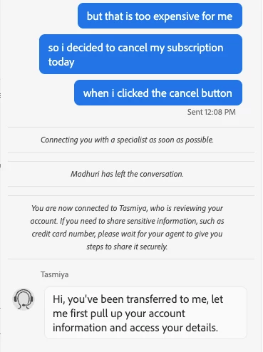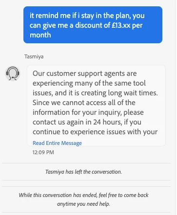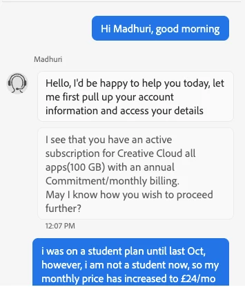 I have been subscribing to Adobe software since October 2020. Since I was no longer a student from October 2023, the price increased to £24 per month, which I couldn't afford. Therefore, I decided to cancel my subscription today. After I clicked the cancel subscription button, Adobe offered me a discount of £13 per month. I found this acceptable, so I chose to continue my subscription. However, I noticed that the monthly price did not change. Consequently, I contacted online customer service. Three different representatives were involved in my conversation, but each of them left immediately upon hearing my request for a refund. Not a single one spoke to me. I have screenshots of the conversation here. It's utterly ridiculous. Such a reputable company treats their customers this way.