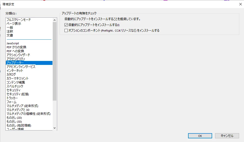 - 環境設定 > アップデータ > オプションのコンポーネント(Preflight、CCJKリソースなど)をインストールする のチェックをつけます。