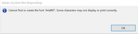 2. "Cannot find or create the font ‘ArialMT’. Some characters may not display or print correctly."