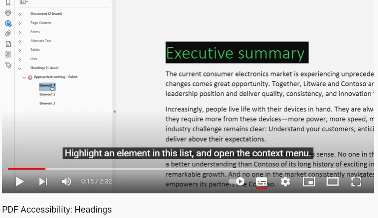 I've having issues resolving accessibility issues with a document. I've followed tutorials but for the nested headings issue, I don't have a drop down option (see tutorial video screenshot for comparisson with my PDF scnreenshot).