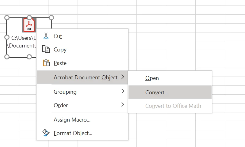 After inserting a PDF file in excel via the object insertion and trying to convert it via the "Acrobat Document Object > Convert... " option the Object type list is empty with Exccel and Adobe Acrobat both installed and up to date to latest version.