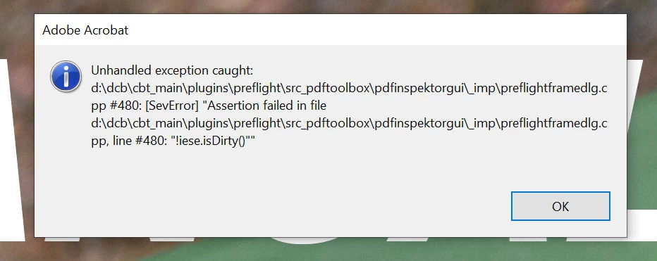When clicking "Preflight" acrobat crashes with the attached error. Re-installing Acrobat did not help.