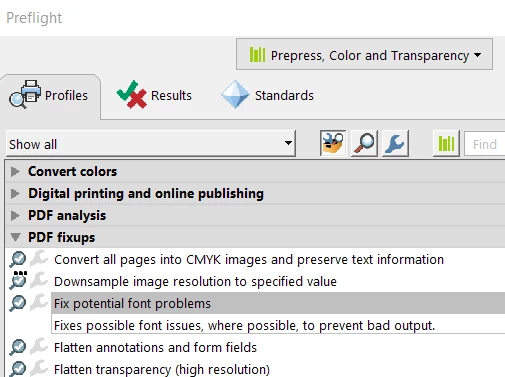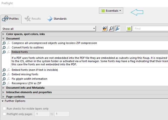 I have a pdf file with several fonts that aren't embedded. I cannot find the 'embed font' option in Acrobat Pro 2017. After Googling I found something about changing Essentials to 'Acrobat Pro DC 2015 Profiles' but that was not in the list. Pre-press, color and Transparency doesn't show it either. So how do I embed fonts in Acrobat Pro 2017?