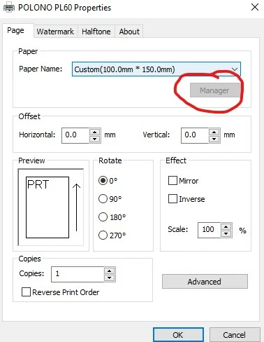 So I'm trying to set a custom size to print some labels with my thermal printer but in Acrobat properties the "manager" button is grayed out that I need to use in order to change the size. Any idea why this may be happening? Thermal printer is on and functioning like normal.