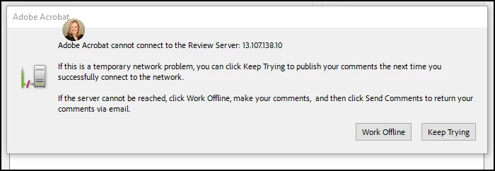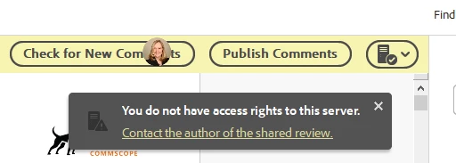 Here are examples of screens you may see when using Adobe Acrobat to open a Shared Review PDF demonstrating the problem.