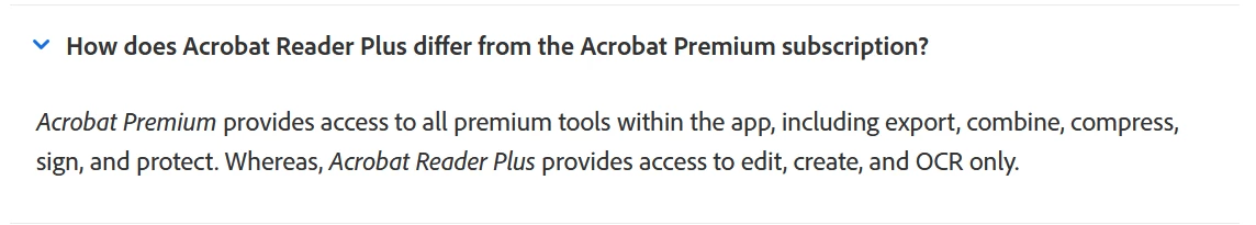 Even the deep learning robot ai assistant has no idea what Adobe Acrobat Reader Plus is supposed to do or how it compares to Reader Premium.