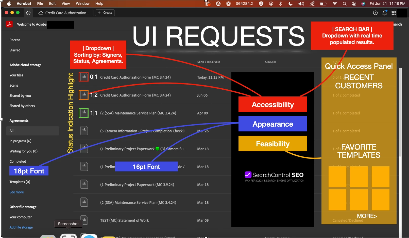 The current layout of Adobe Acrobat for Mac Os is not user friendly. For a business, it is hard to easily manage and obtain the big picture of all pending and signed forms. Ive been using this for about 6 months and I dislike the current layout. Please consider my requests for the UI.