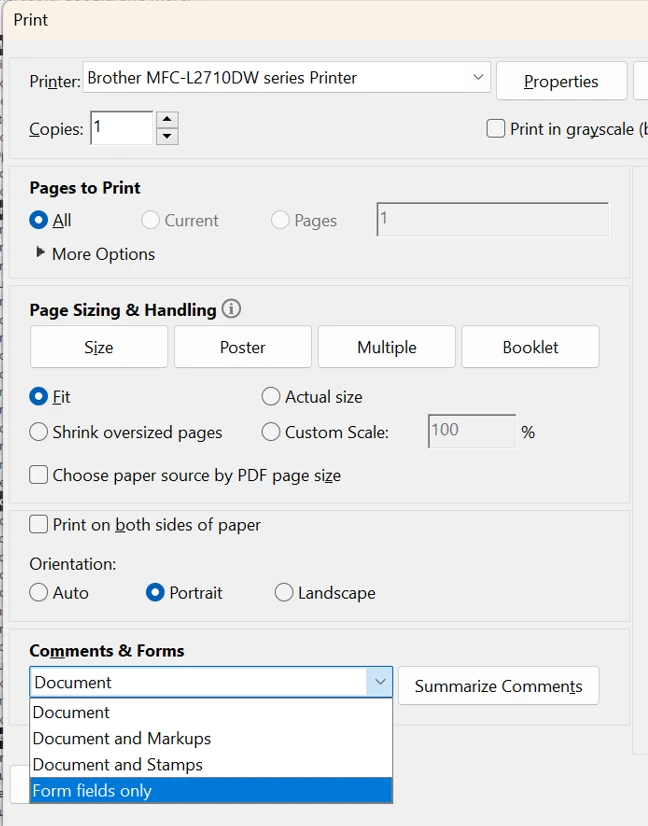 I'm having an issue with printing a PDF from Adobe. The document is perfectly viewable, but when I go to print, it shows up and prints blank, or only the fields that are filled out and none of the actual form. I have attached an image of what I see (some doc info blurred).