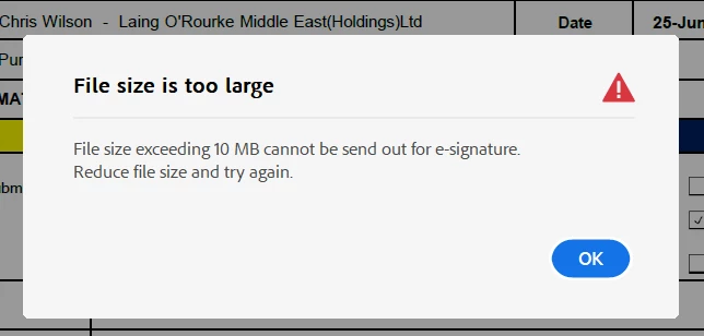Adobe Sign has a default 10MB limit on the file size that can be sent. If the file is too large,