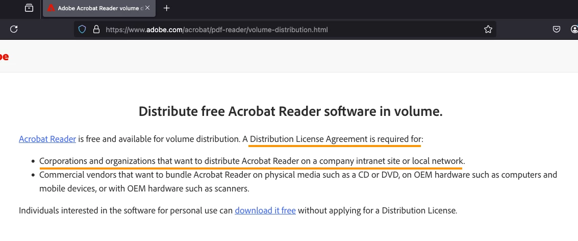 @Václav28401032ww1z You're correct that Adobe Reader DC is free for personal and commercial use. But, when it comes to installing it on a Remote Desktop Server (RDS) you indeed a license.  Actually, you might even need to buy a license for each user who accesses Adobe Reader DC on the RDS server for that matter.... According the attache article, Adobe can offer different licensing models for RDS deployments, including named user licensing and serialized deployments. These models ensure that each user accessing the software on the server has a valid license.