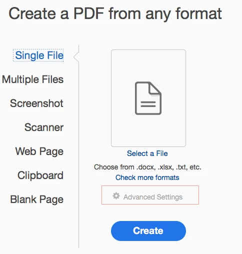 I have Adobe Acrobat DC installed on  OSX High Sierra.  In the Tools pane, when I select Create PDF, underneath the Select a File command, I see Advanced Settings. But it's greyed out and can't be selected. Any tips as to why?