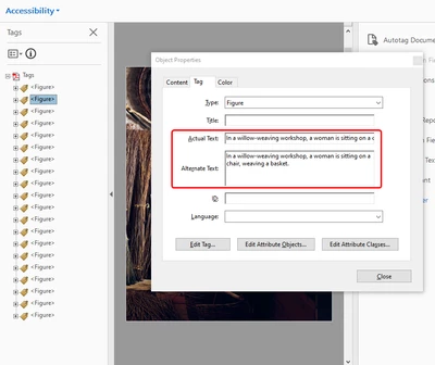 I used "Edit Alternate Text" (see, pic 1), and entered some text in the "alt-text dialog box" (see, pic 2). Then I checked to right-click on "figure tags" and it seemed twice (see, pic 3). why?