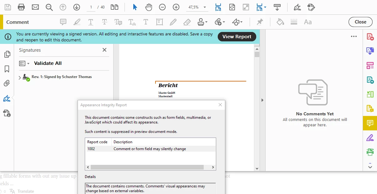 We got signed PDF with valid signatures. Viewing the signed version the Appearance Integrity Reports lists a Report code 1002 "The document contains comments".