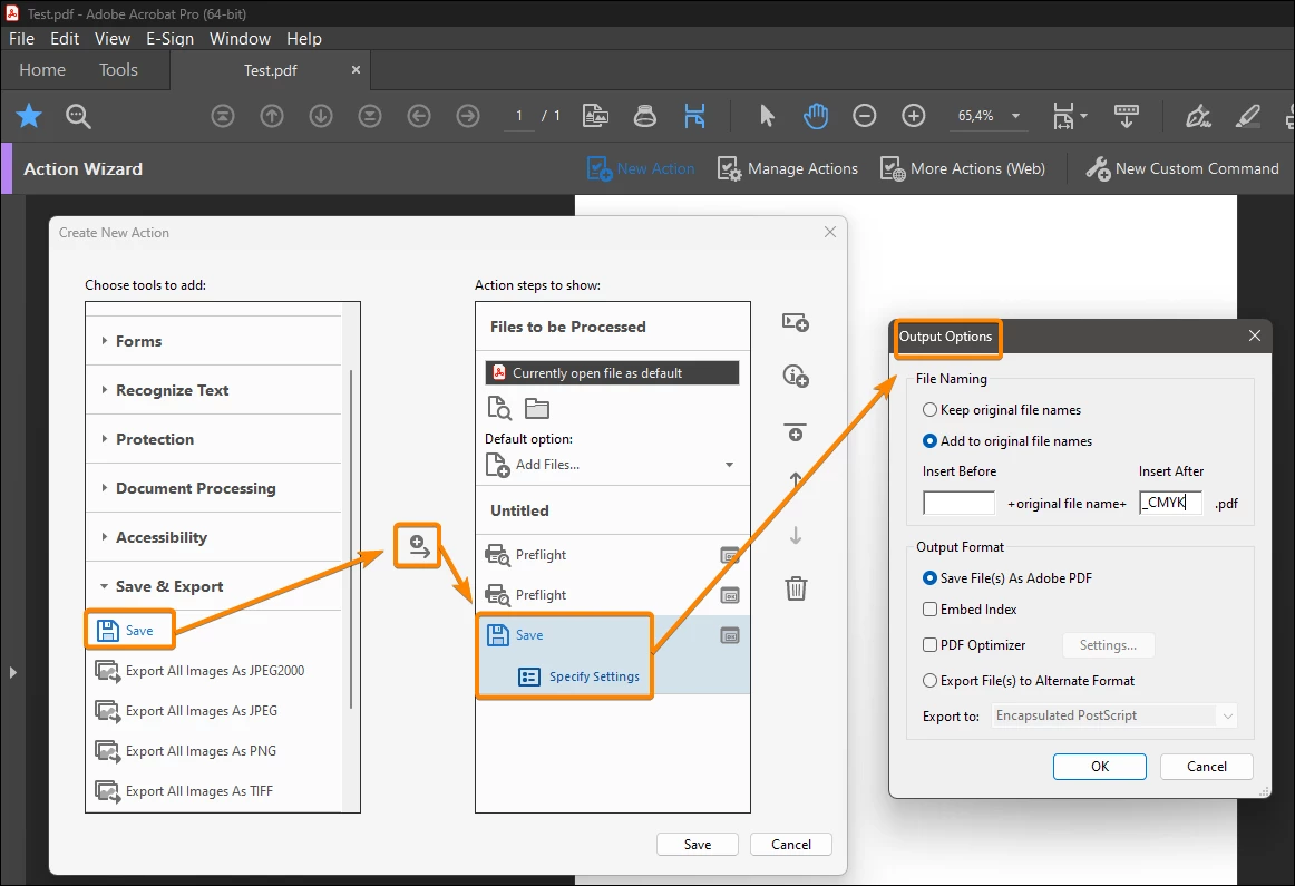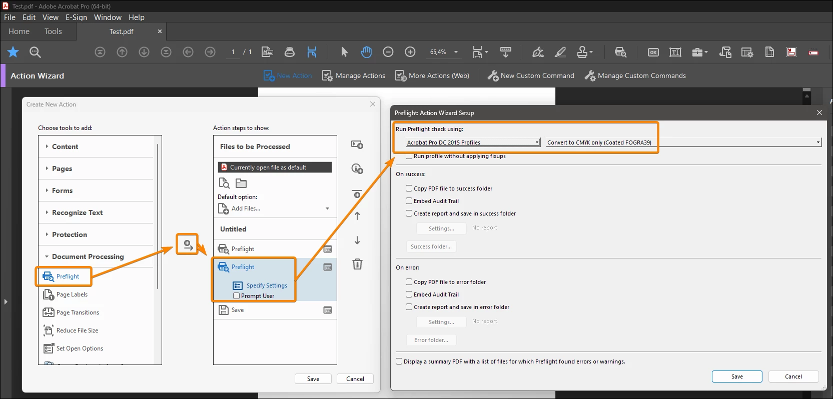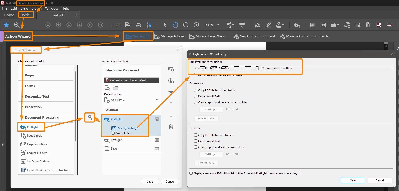 How can I create an action/script for converting font to outlines. I work in a prepress bureau, we have a job that needs font converted to outlines and images converted from RGB to CMYK for over 500 individual pdf files.