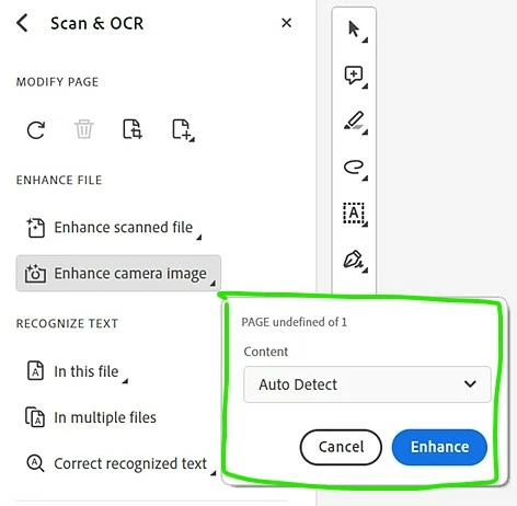 I important an image to be enhance. Click OCR on the left, then click the Enhance Camera Image. Sometimes the blue corners/handles appear. When they do, I adjust them as necessary. However, the drop-down (in green box attached) never appears. I had to do a screenshot from an online source for this.