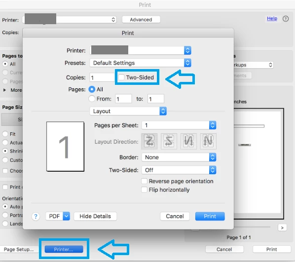 I cannot print pdf files double sided. I just finished with printer tech support and installed printer drivers and re-installed printer. The print dialogue box does not give me the option of checking 'print both sides of page'. Printer tech support said it was an adobe issue since I can print double sided using other apps. I am using a Brother MFC-L5900DW printer.