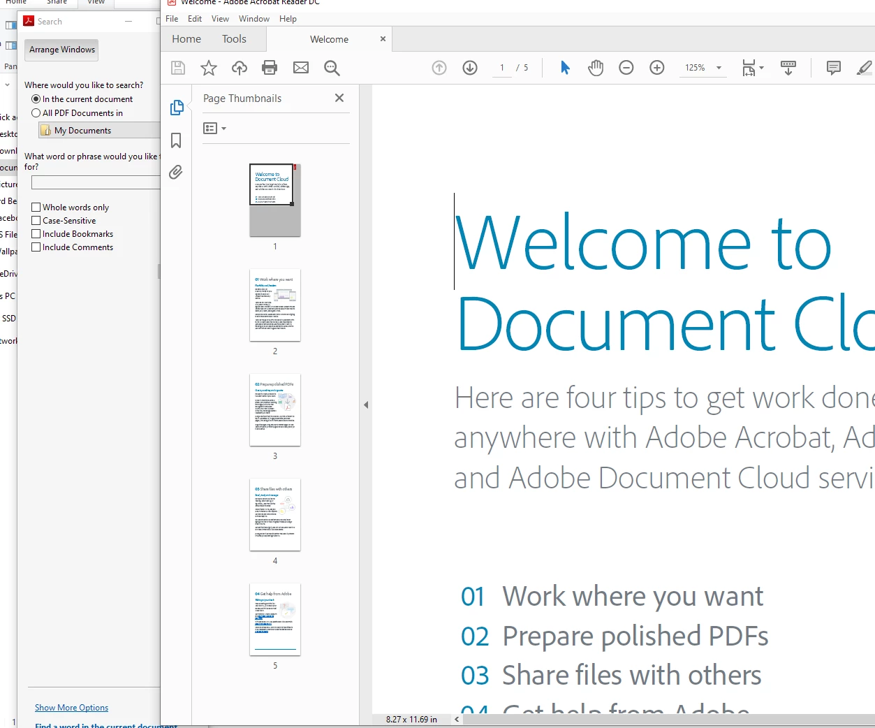 At work it's common for me to have 5+ windows up on my monitor and I often need to search long PDFs. I'm extremely frustrated that everytime I minimize Adobe I need to deal with the advanced search window seperately. Is there an option I'm missing where it could dock onto the side bar or something?