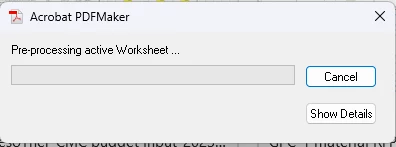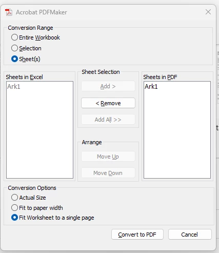 After saving my Excel file, I choose "Save Adobe PDF", and the following window pops up: