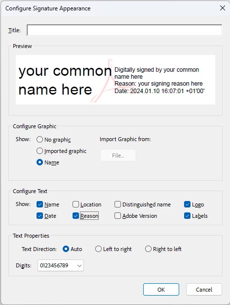 Nonetheless, if you want the in-document visualization of the signature to contain a Reason line, you have to start by defining a custom appearance at the bottom of the signature creation and appearance dialog you show. In the dialog that opens when you click on New you see