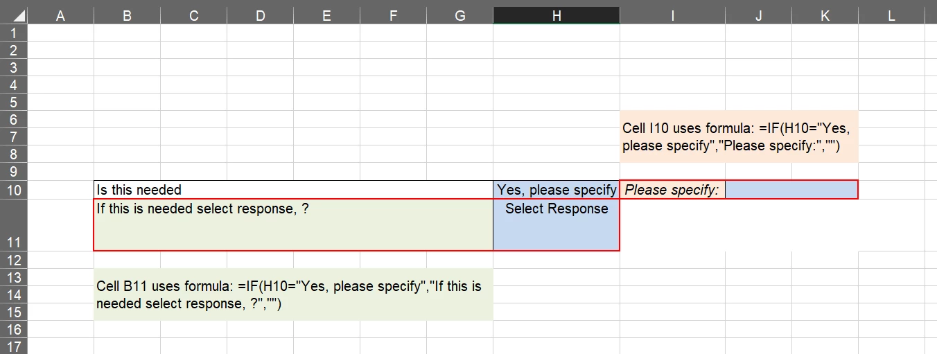 For example, below I have a drop down menu in Cell H10 with options "Yes, Please specify" and "N/A".