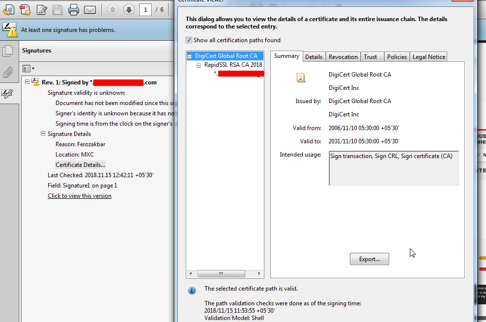 Digicert ssl signed PDF showing 'signer's validity unknown..'