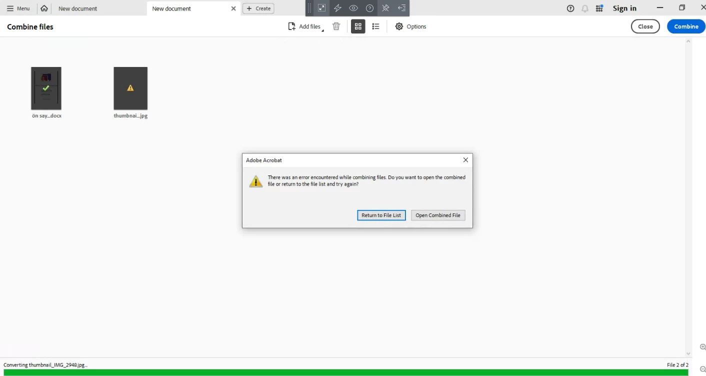 Adobe Acrobat Pro, Continious Release | Version 2023.006.20320 | 64-bit editon is already setup on our local computer. System ready with windows 10 64-bit. When we try to combine docs and jpg extension files at the same time the application shows error and files can't combined into single pdf file. Error shown below and attached document. The message says 'There was an eror encountered while combining files. Do you want to open the combined file or return the file list and try again?'